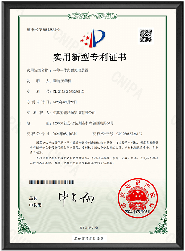 國內大中型環保集團--江蘇寶蛙環保集團有限公司,地處中國歷史文化名城揚州市經濟技術開發區內。首創于 2012 年,注冊資金 10000 萬元人民幣,占地面積 50 畝,總建筑面積 3 萬 5 千多平方米,其中廠房面積 1 萬 9 千多平方米,公司現有員工 200 余人,其中各類專業技術人員 30 余人,年產值可達 5 億元以上。自有激光切割機、加工中心、大型液壓剪板機、液壓折彎機、龍門銑床、立臥式車床、鉆床、各類進口焊機、探傷檢測儀等大中型機械加工檢測、試驗設備。并順利通過了 ISO9001:2015 質量管理體系認證、ISO14001:2015 環境管理體系認證以及 ISO45001:2018 職業健康安全管理體系認證;獲得了“全國工業產品生產許可證書”、“企業信用等級 AAA 證書”等榮譽稱號。健全的管理體系、雄厚的技術力量先進的制造設備及生產工藝、完善的檢測手段,使公司未來可獲得快速穩定的發展。